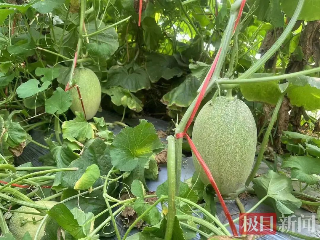 在瓜棚里,极目新闻记者看到现场有不少村民正在给还未成熟的瓜藤做管护。龙子瀛介绍,哈密瓜在种植、管理、采摘全过程都需要大量人工投入,瓜棚里每天有10余名村民在采摘园做工,人均年收入3万元左右。