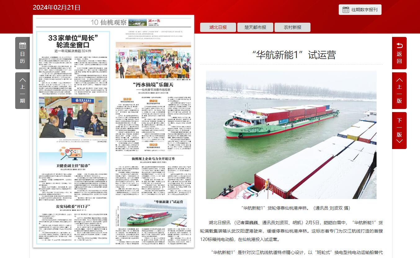 湖北日报讯 (记者雷巍巍、通讯员刘贤双、胡凯)2月5日,皑皑白雪中,“华航新能1”货轮满载集装箱从武汉阳逻港驶来,缓缓停靠仙桃港岸桥。这标志着专门为汉江航线打造的首艘120标箱纯电动船,在仙桃港投入试运营。