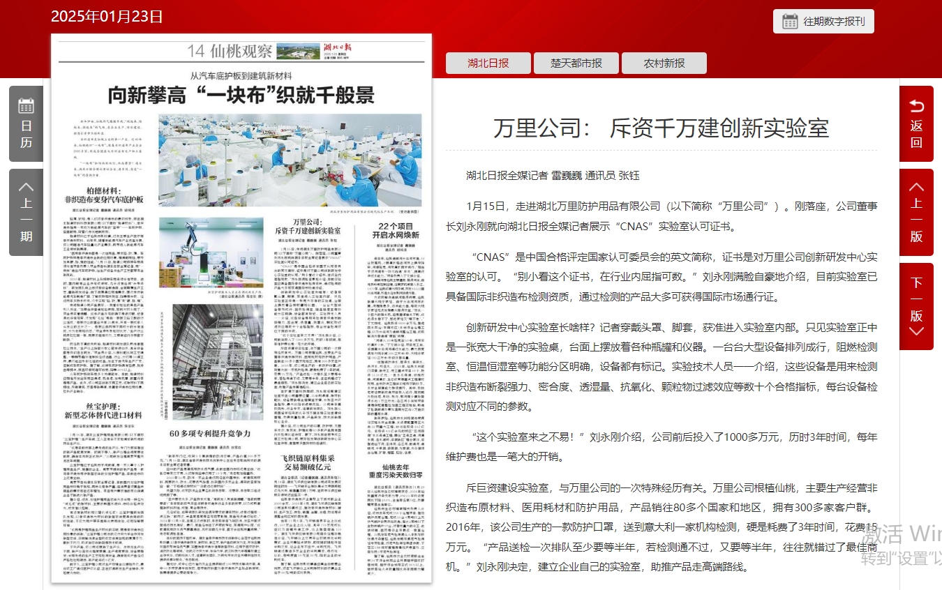 1月15日,走进湖北万里防护用品有限公司(以下简称“万里公司”)。刚落座,公司董事长刘永刚就向湖北日报全媒记者展示“CNAS”实验室认可证书。