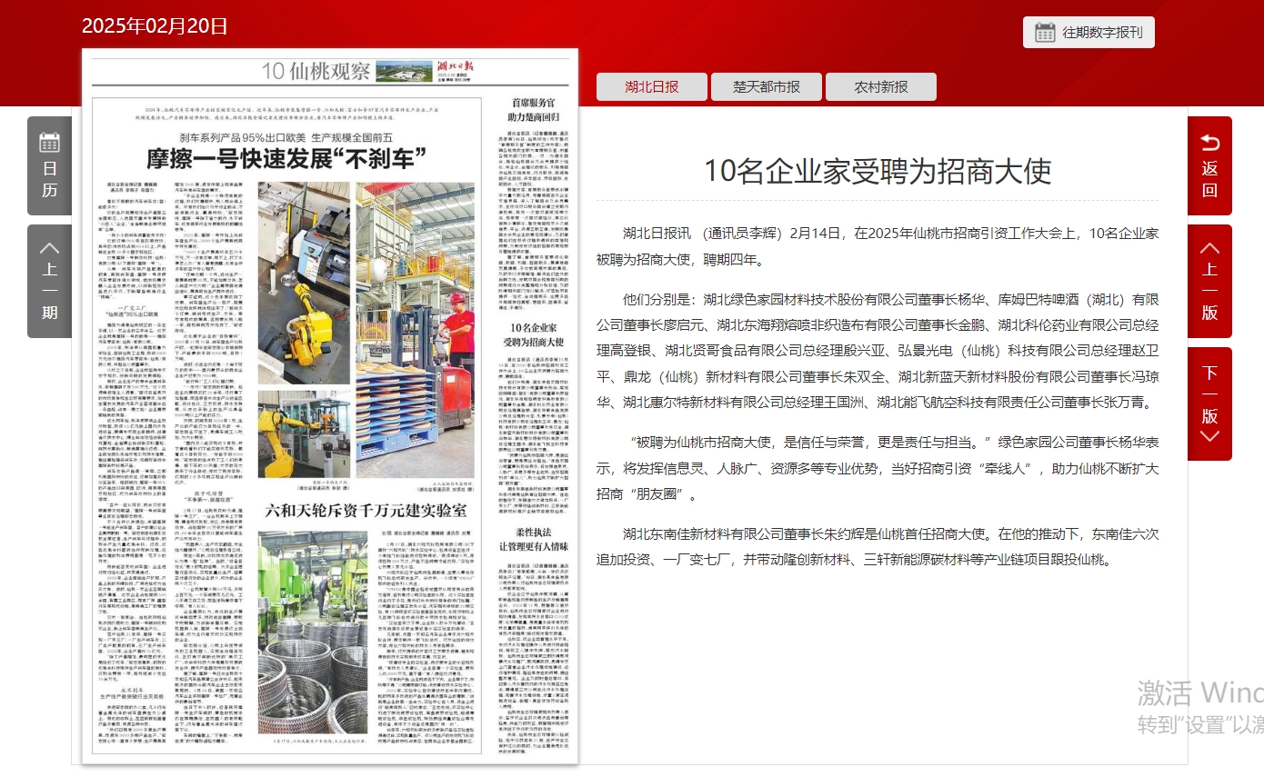 湖北东南佳新材料有限公司董事长朱约辉是仙桃首任招商大使。在他的推动下,东南佳六次追加投资、一厂变七厂,并带动隆创新材料、三轩新能源碳材料等产业链项目跟投仙桃。 (通讯员李辉)