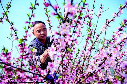 图为:今年3月,许先平在桃树上疏花剪枝。
