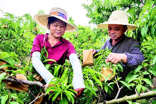 图为:许先平指导妻子给桃子套袋,防止病虫害。
