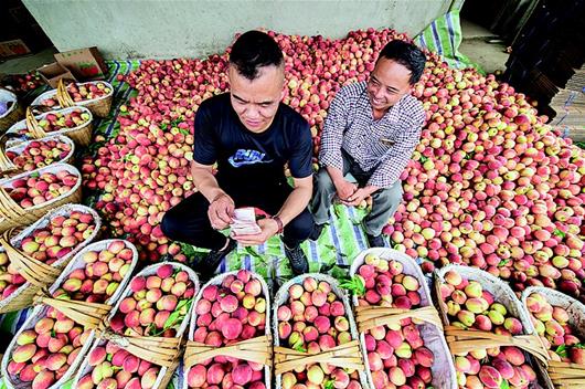 图为:5月25日,今年首批早熟品种的桃子被抢购一空,许先平(右)和合作伙伴都赚钱了。