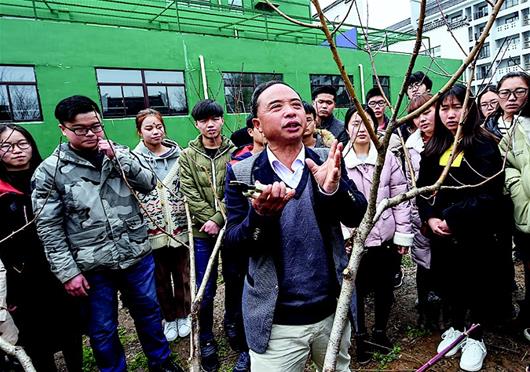图为:今年3月,许先平在武汉生物工程学院指导大学生修剪桃枝。