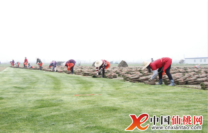 4月6日,记者在西流河镇绿之林草坪基地看到,草坪绿草如茵,长势喜人,工人们弯腰卷草皮劳作忙。