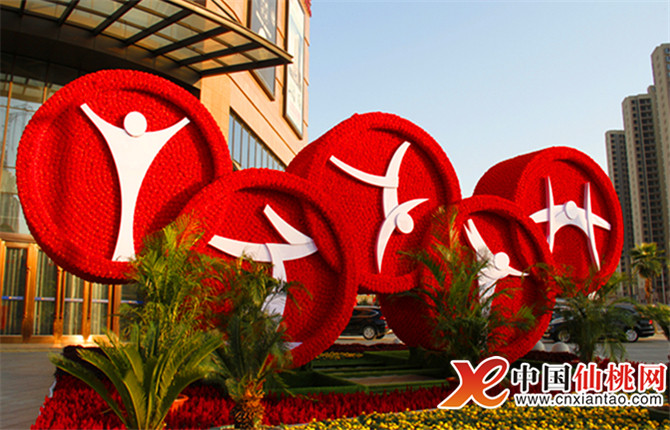 沔街上的“体操之乡”花展,以五环为背景,五环中镶嵌体操运动姿态的人物剪影,展现了仙桃“体操之乡”的光辉形象。