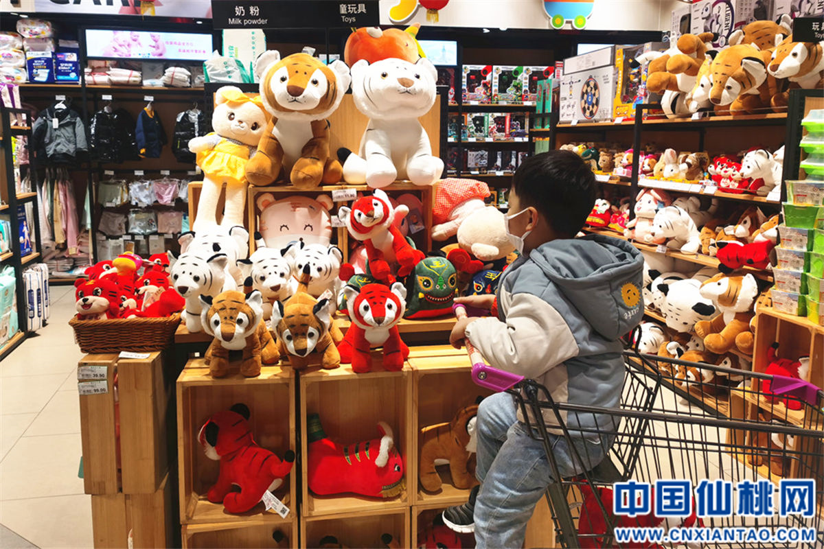 春节临近,我市超市、商店礼品柜台上各类老虎饰品琳琅满目,以老虎为主要元素的饰品和玩具把卖场装点得虎气十足,新年气氛扑面而来。图为,1月18日,在市区某大型超市,市民正在挑选可爱的卡通老虎公仔。(仙桃网记者 黄芸)