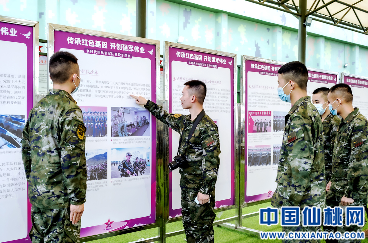活动当天,一场以“传承红色基因,开创强军伟业”为主题的展览在军营中拉开帷幕,50多块展板在综合训练馆内一字排开,官兵们阅读展板了解在习近平强军思想指引下新时代中国如何建设世界一流军队,记牢作为军人肩上的责任与重担。