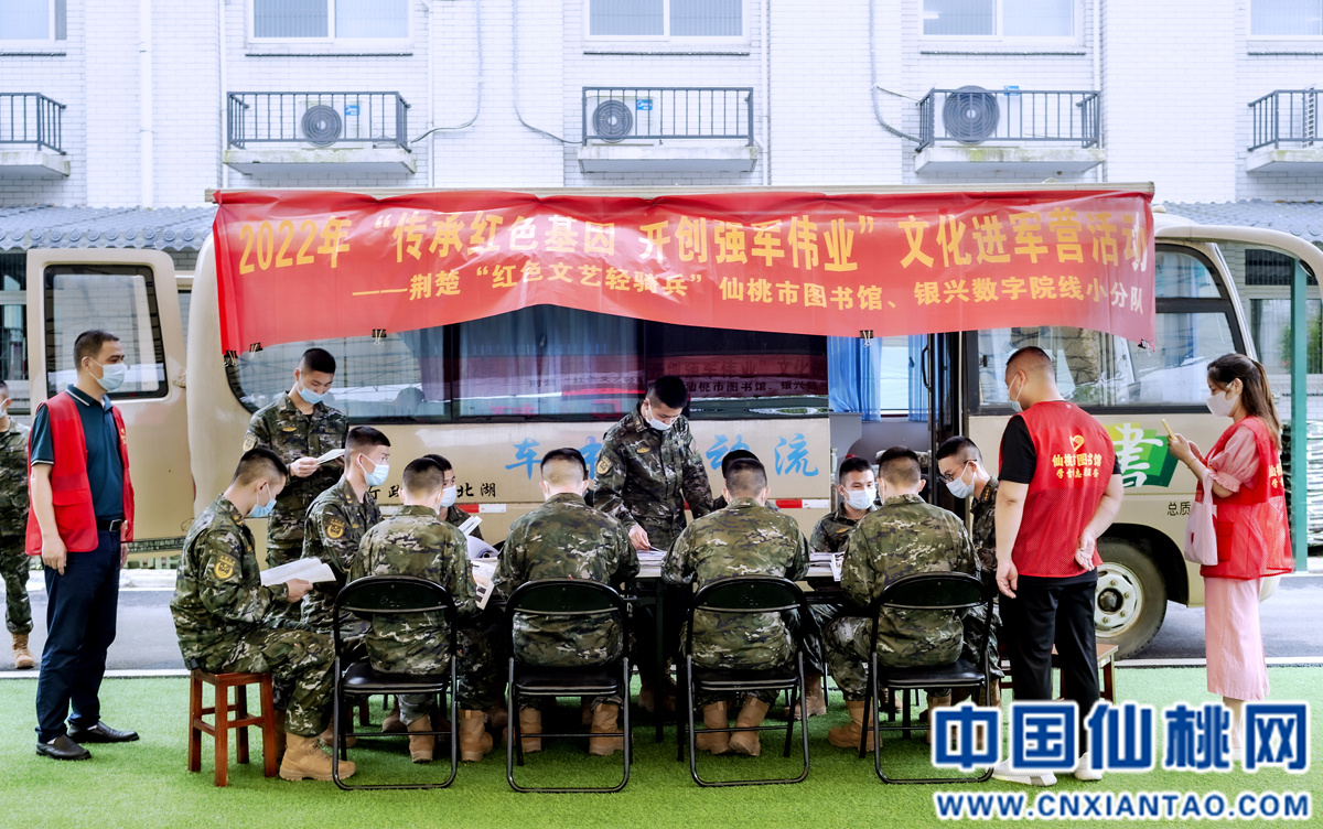 在中国人民解放军建军95周年到来之际,为丰富广大驻军官兵的文化生活,不断完善和加强我市“双拥”工作,7月28日,市图书馆、银兴农村数字电影院线荆楚“红色文艺骑兵”联合小分队赴驻仙部队军营开展了“文化拥军”活动,给武警官兵们带来一场别样的文化盛宴。