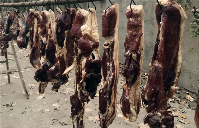 制作过程中,首先,将肉类、鱼类等食材用盐腌渍,通过向肉品中加入食盐,使其成为高渗,以抑制或杀灭肉品中的某些微生物,同时高渗环境也可减少肉制品中的含氧量,并抑制肉中酶的活性,从而达到食品保藏的目的;其次,腌鱼腌肉时隔三天翻动一次,一周后便可晒了,晒时一定要放在通风、阴凉的地方,让食物中的水分脱掉,防止发霉;最后,将晒干的鱼、肉挂在避光通风的地方,防止脂肪氧化酸败。