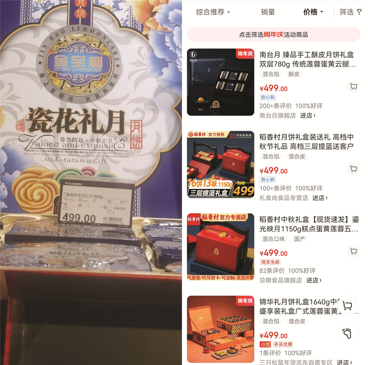 记者随后以月饼为关键词进行线上搜索,并选择价格从高到低排序且尝试进行结算,在淘宝和京东两大APP上面,单盒月饼最高结算价均为499元。
