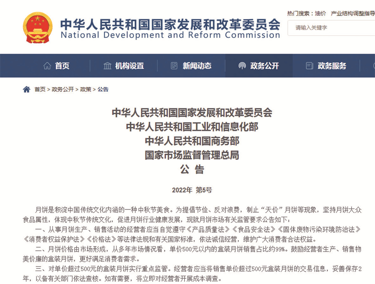 据了解,今年6月,国家发展改革委、工业和信息化部、商务部、市场监管总局联合发布《关于遏制“天价”月饼、促进行业健康发展的公告》(下称《公告》),针对“天价”月饼暴露的突出问题,在坚持月饼价格由市场形成的基础上,综合运用市场化、法治化手段,推动企业守法经营、合理定价,促进月饼行业健康发展。