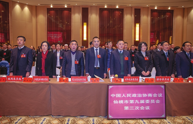 昨日,政协仙桃市九届三次会议开幕,委员们高唱国歌。 (摄影记者 晴霄)