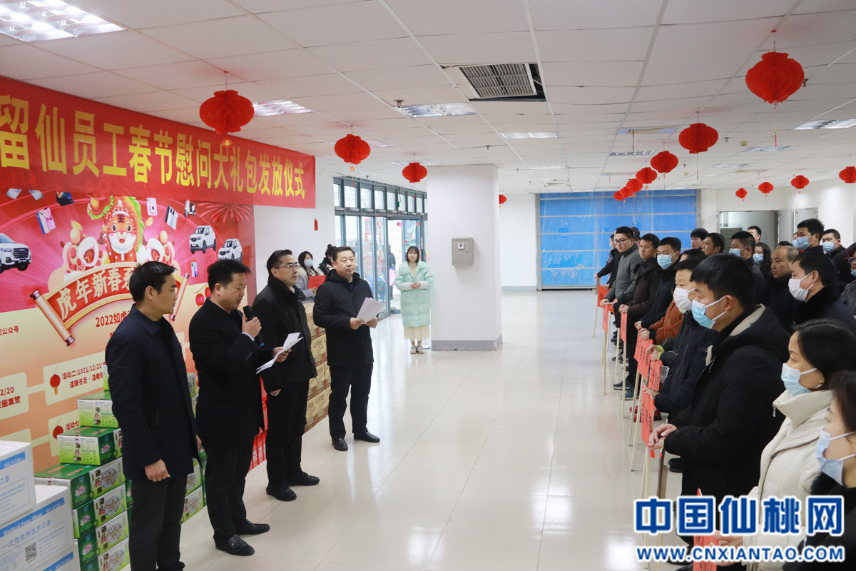 启动仪式上,孙道军为各地企业代表依次发放新春大礼包, 并通过他们向所有外地留仙过年人员拜年,感谢大家为仙桃建设与发展所作的贡献,祝大家新年快乐、身体健康、万事如意,祝企业新的一年顺风顺水、虎虎生威。