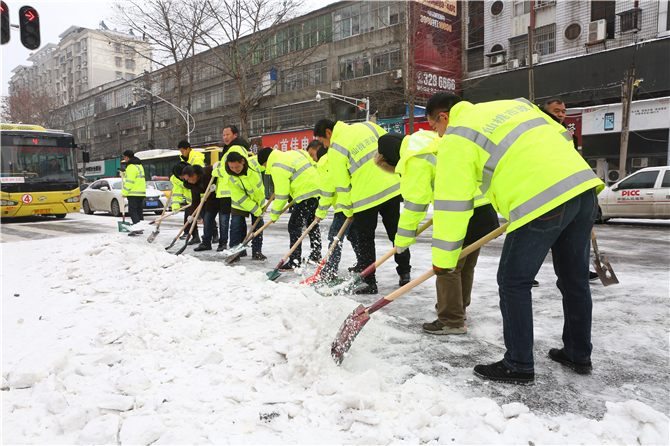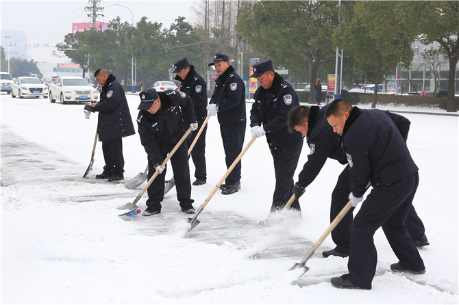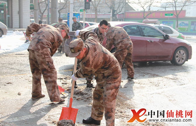 市人武部组织机关干部上街扫雪除冰
