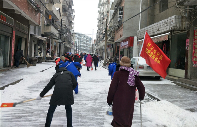 1月27日,好义街社区全体干部及网格员、社区民警、志愿者与中石化、林业局、地税局三个单位的在职党员,在解放大道、沿江大道及各小区内开展义务劳动,清除路面积雪。(本网记者 郭闪)