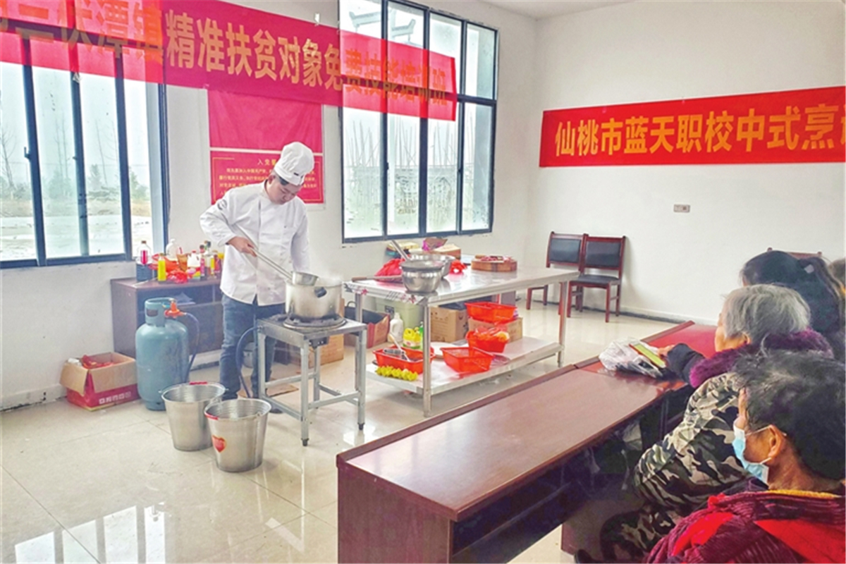 11月28日,为提升贫困劳动力就业技能水平,增强脱贫致富的信心,市劳动就业管理局组织培训师到三伏潭镇红杨树村开展烹饪技能免费培训,助力贫困户在家门口就业。图为贫困户正在观摩烹饪技能。(仙桃日报摄影记者 刘贤双)