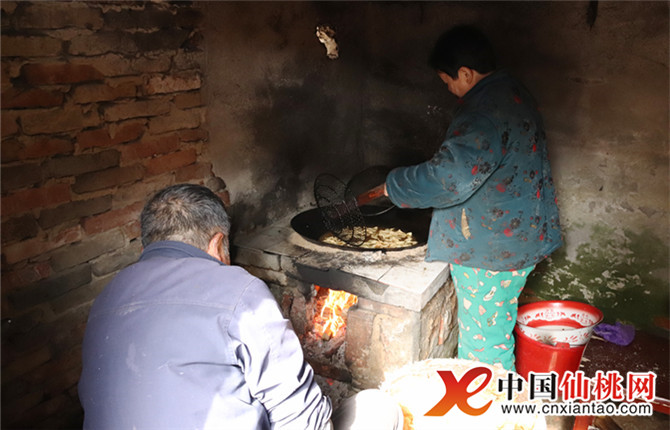 周三团的老伴是屋里最活跃的人,不断来回小跑。既要添柴火、又要切面饼、还要当搬运工将半成品“翻饺子”传给周三团,忙地满脸通红。68岁的周三团精神抖擞地站在柴火灶前,两手各拿一个大漏勺,将油锅里的“翻饺子”来回拨动,不一会,香气扑鼻的金黄色“翻饺子”就出锅了。“我们全家都喜欢吃翻饺子,身体不如从前了,有一年没做,自己买的,感觉不好吃,今年还是自己做,昨天已经把炒米炒好,今天就可以把翻饺子放好了,呵呵……”周三团兴奋地告诉记者“翻饺子”的做法:“20斤面粉、15个鸡蛋,加盐、南德、芝麻、葱、蒜苗,和面、切合适大小、用擀面杖揉成薄薄面饼、卷起用刀斜切、放到油锅一炸,就可以吃了。这不,做了满满一箩筐。”